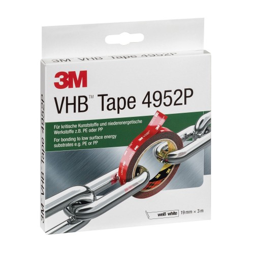 Nuestra cinta 3M™ VHB™ 4952 forma parte de la familia 4952 de cintas 3M VHB. Tiene una adhesivo capaz de adherir en sustratos de baja energía superficial en ambas caras de un núcleo de espuma dura.